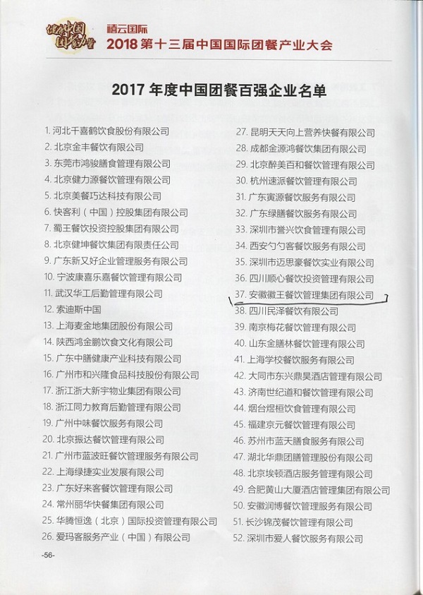 經(jīng)過徽王人的不懈努力,2018年5月13日安徽徽王餐飲管理集團(tuán)有限公司于陜西省西安市,在中國烹飪協(xié)會(huì)主辦的第十三屆中國國際團(tuán)餐產(chǎn)業(yè)大會(huì)上被評(píng)為2017年度中國團(tuán)餐百強(qiáng)企業(yè)。